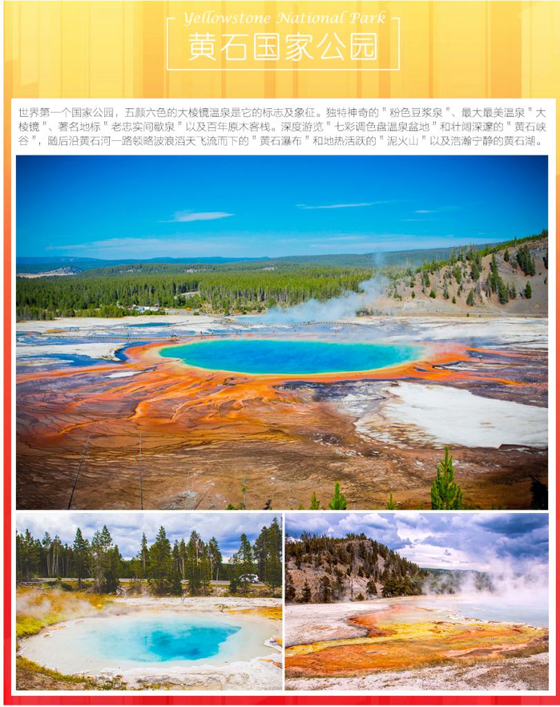 (黃石公園是火山區(qū),地?zé)岈F(xiàn)象周圍由板橋圍繞,平均每個景點需步行30分鐘,請穿舒適鞋子)