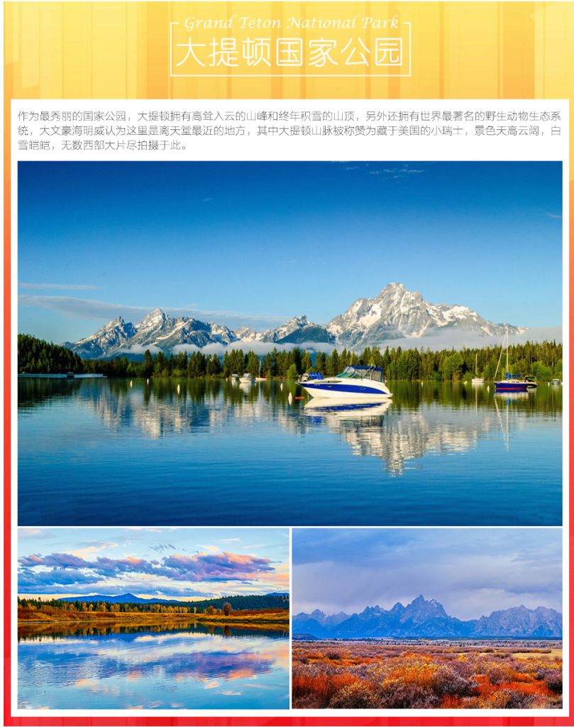早上在酒店整裝出發(fā)(溫馨提示:黃石公園位于落基山脈之中,海拔約7000英呎;盛夏七八月早上溫度有時只有4℃,請注意保暖)當(dāng)您還沉醉于昨天精彩行程帶給您的驚喜而依依不舍時,今天我們一起去感受大黃石生態(tài)圈的秀美!神秘靜謐的森林;浪漫迷人的黃石湖;霧氣騰騰的河流都讓人不禁感嘆大自然的神奇。隨后進(jìn)入大提頓國家公園,萬年不化的冰河覆蓋在巍峨的大提頓山脈上,藍(lán)天森林環(huán)繞,倒映在山腳下處子般的杰克森湖上,蛇河蜿蜒流過,宛如仙境!隨后來到道地的西部牛仔小鎮(zhèn) - 杰克遜,這里也是世界聞名的度假圣地,搭乘纜車至海拔萬呎山峰俯瞰杰克森山谷、巍峨大提頓山脈。夜宿普沃。