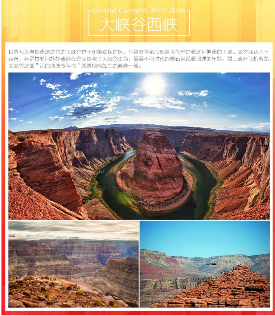 清晨我們驅(qū)車前往世界七大奇景之一的大峽谷國家公園,領(lǐng)略造物主的神奇。即使滄海桑田,斗轉(zhuǎn)星移,時間在大峽谷刻下了長情的告白。置身其中,蔚為壯觀。銹紅色的巖石,奔騰谷底的河流,形單影只的枯樹,山頂盤旋啞叫的烏鴉,都在訴說無言的故事。以個人之渺小體驗自然之大美,我們只能順服于天地,更加敬畏自然。在這里,每一位過客都是攝影家,每一張照片都是風(fēng)景畫,每一個不爭的瞬間、不忿的心情、不展的眉頭都在這浩瀚廣闊中煙消云散。離開大峽谷公園,我們會前往著名的胡佛水壩,亦可遠(yuǎn)眺北美最大的人工湖-密德湖。夜宿拉斯維加斯。