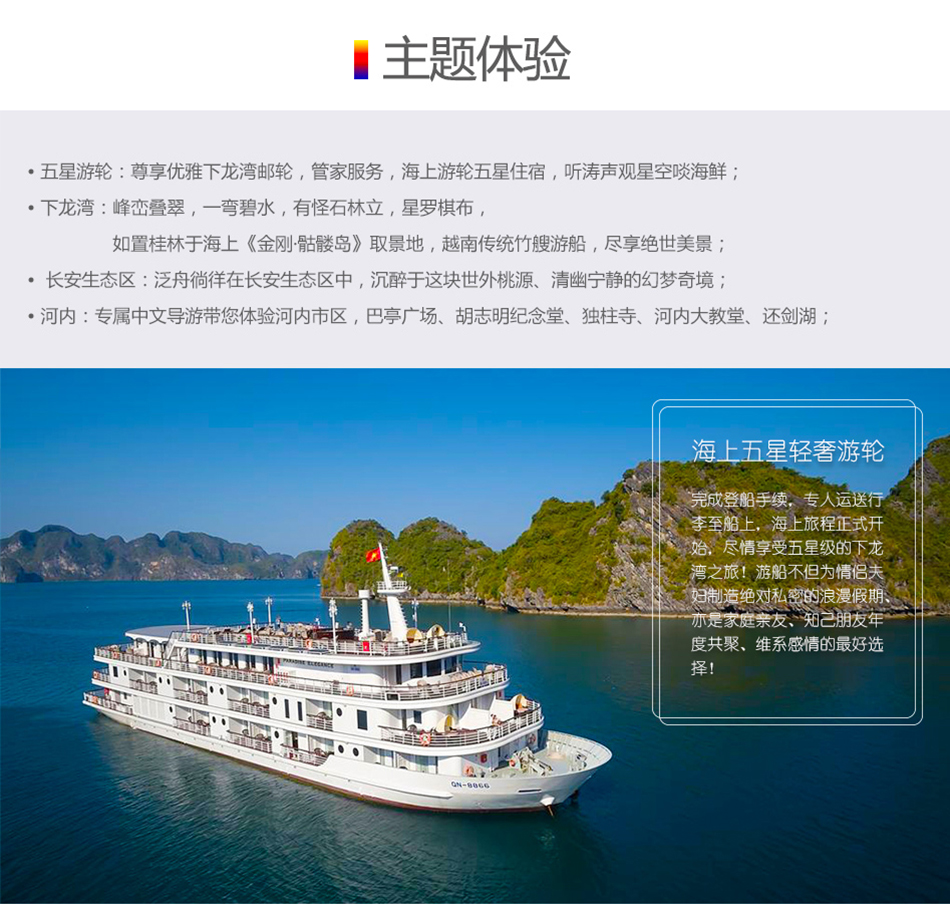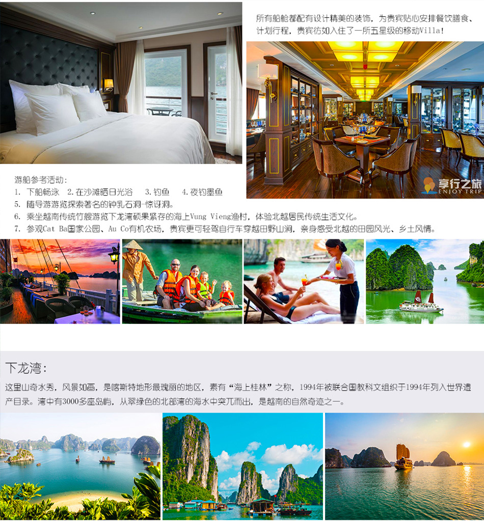 5、當(dāng)?shù)刂形膶?dǎo)游服務(wù)(入住下龍灣游輪當(dāng)天會(huì)由游輪公司車從酒店接貴賓前往游輪,次日中餐后再送返酒店,此過程中導(dǎo)游不陪同)。