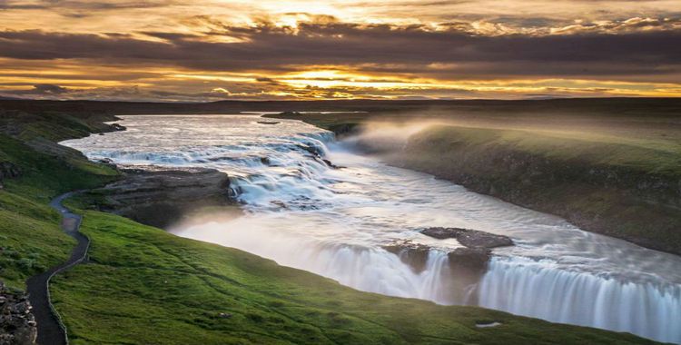 河流從32米的高處飛流直下,分為兩級(jí),上級(jí)落差11米,下級(jí)落差21米,寬100多米遠(yuǎn)遠(yuǎn)看去就好像兩條彩虹,沿著大裂谷奔流而去,場(chǎng)面十分的壯觀,因水流湍急,看似金黃色,故得名。如果在一場(chǎng)大雨后,還會(huì)看到彩虹橫跨在瀑布上。瀑布旁邊立了一塊碑,是為了紀(jì)念一位平民婦女。陽(yáng)光下,在蒸騰的水霧中,布滿閃著金光的點(diǎn)點(diǎn)水滴,亮艷的彩虹若隱若現(xiàn),仿佛整個(gè)瀑布是用黃金造就。