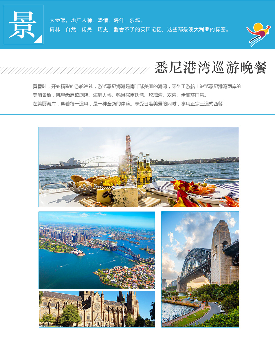 黃昏時,開始精彩的【晚餐游輪巡禮游覽】悉尼海港是南半球醉 美麗的海灣,乘坐于游船上飽覽悉尼港灣兩岸的美麗景致,眺望悉尼歌劇院、海港大橋、高 及住宅區(qū)------暢游屈臣氏灣、玫瑰灣、雙灣、伊麗莎白灣。在極美海岸,迎著每一道風(fēng),是一種全新的體驗。享受日落美景的同時,享用正宗三道式西餐。