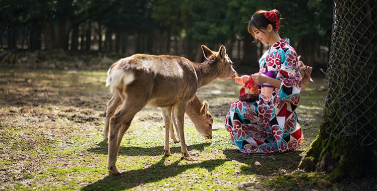 下午,前往【奈良公園】與小鹿近距離接觸。奈良公園較為引人注目的是梅花鹿,其中有1200頭鹿生活在這里,這些鹿大多溫順而討人喜愛。每年10月,會(huì)舉行傳統(tǒng)活動(dòng)“割鹿角”