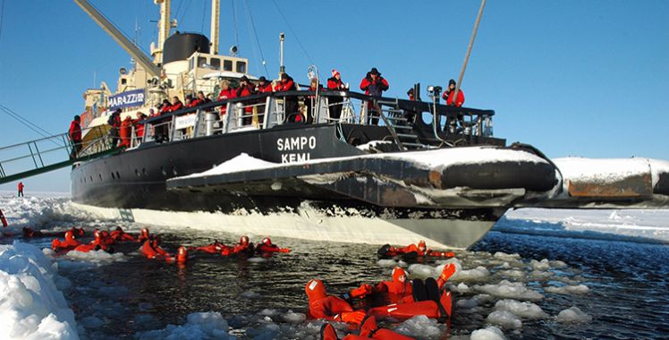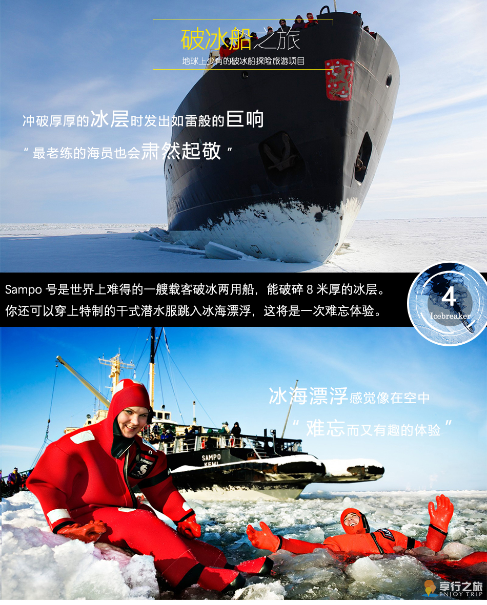 早餐后出發(fā)前往碼頭,登上拉普蘭地區(qū)醉大的破冰船體驗此行不容錯過的冰海漂浮,你不僅可以看到震撼的破冰全過程,船上的導(dǎo)游還會細致解釋破冰的原理,并參觀船長室和引擎室,后是行程的高潮——穿上特制的干式潛水服跳入冰海漂?。ㄉ砀弑仨毟哂?.3米)。航程結(jié)束后船長會親自頒發(fā)破冰證書,為此段行程畫上一個圓滿的句號。