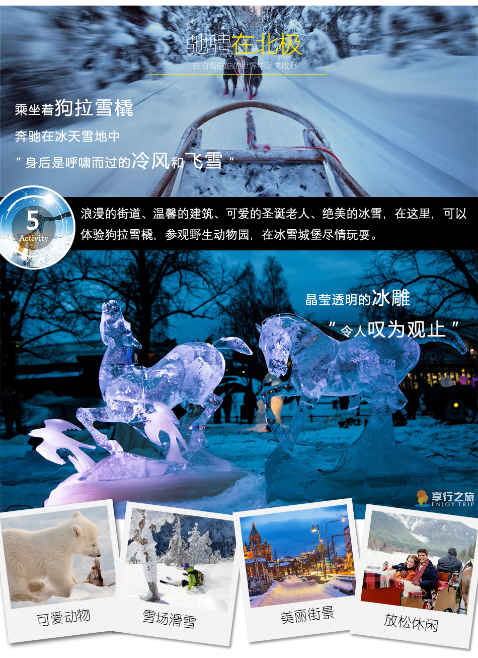 8、行程中所列景點首道大門票,狗拉雪橇、馴鹿場、圣誕老人公園、跨越北極圈證書、與圣誕老人合影、破冰船、凱米冰雪城堡、北極動物園、巖石教堂。