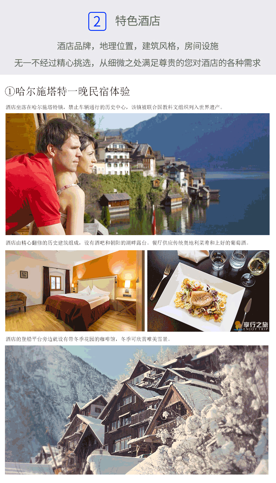欣賞晨光下的哈爾斯塔特。湖邊小鎮(zhèn)哈爾施塔特背山面水,景色優(yōu)美,被譽(yù)“來自天堂的明信片”。同時(shí)還擁有悠久的歷史,早在 2500年就存在發(fā)達(dá)的文明,還有超過900年歷史的世界上古老的鹽礦坑。參觀鹽礦之余,還有機(jī)會品嘗湖中特產(chǎn)美味鱒魚。