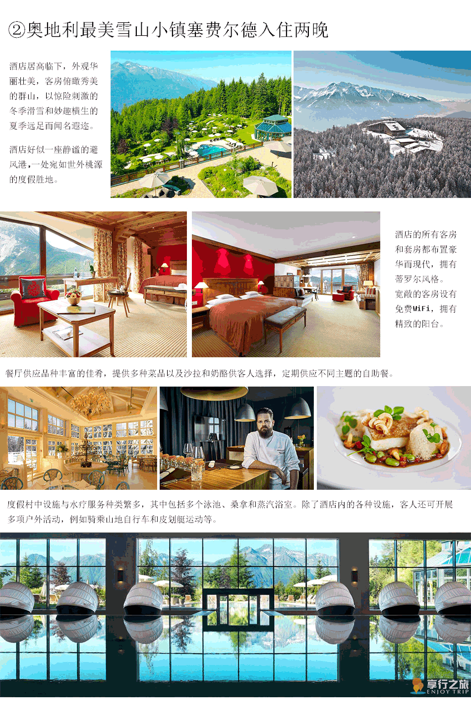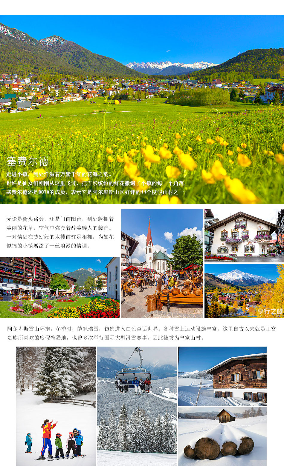 早餐后前往被阿爾卑斯雪山環(huán)抱的小鎮(zhèn)澤菲爾德。這個(gè)小鎮(zhèn)風(fēng)景優(yōu)美、民風(fēng)淳樸,各種雪上運(yùn)動設(shè)施豐富,自古以來就是王宮貴族所喜歡的度假狩獵地,也曾多次舉行國際大型滑雪賽事,因此被譽(yù)為皇 家山村。它還是BOTA的成員,表示它是阿爾卑斯山區(qū)的11個(gè)度假山村之一。