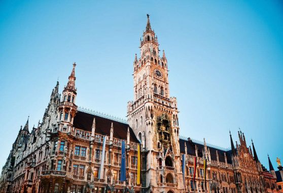 上午游覽慕尼黑老城的中心——瑪利亞廣場。廣場中間是圣母瑪利亞的雕像,北面是高大的新市政廳——19 世紀(jì)末建造的巍峨挺拔棕黑色哥特式建筑。