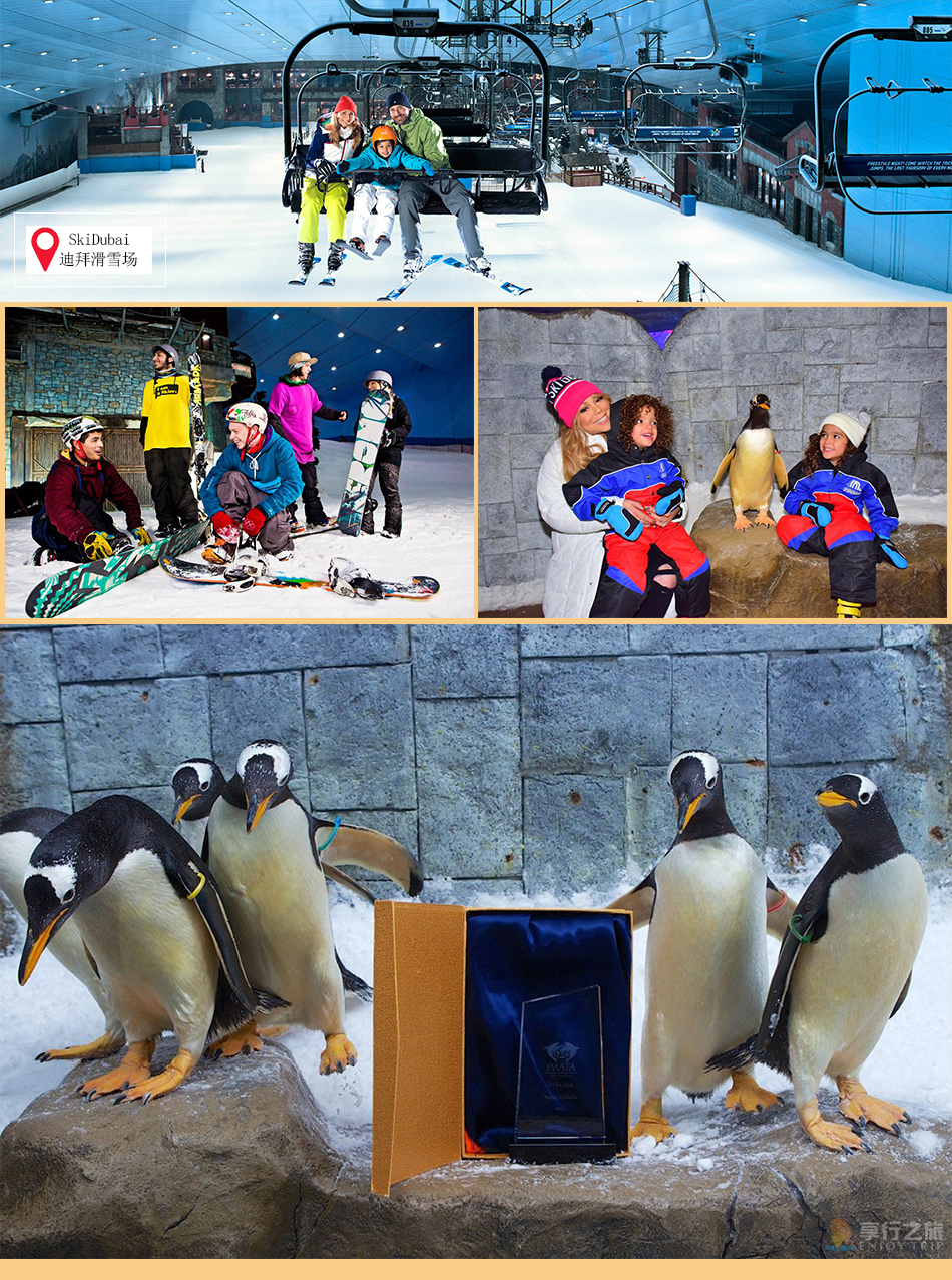 今日睡到自然醒。之后前往迪拜滑雪場。這是一座獨特的雪山主題公園,占地2.25萬平方米,全年覆蓋真實的皚皚白雪,讓您一年四季享受雪中樂趣。這里擁有5條在難度、高度和坡度上變化多端的滑雪道。其中長的一條滑雪道有400米,高低落差達60米。這里為您提供滑雪板、雪橇和其它雪上運動項目。無論男女老少,初學者還是滑雪健將,都可以在這里找到屬于自己的快樂。