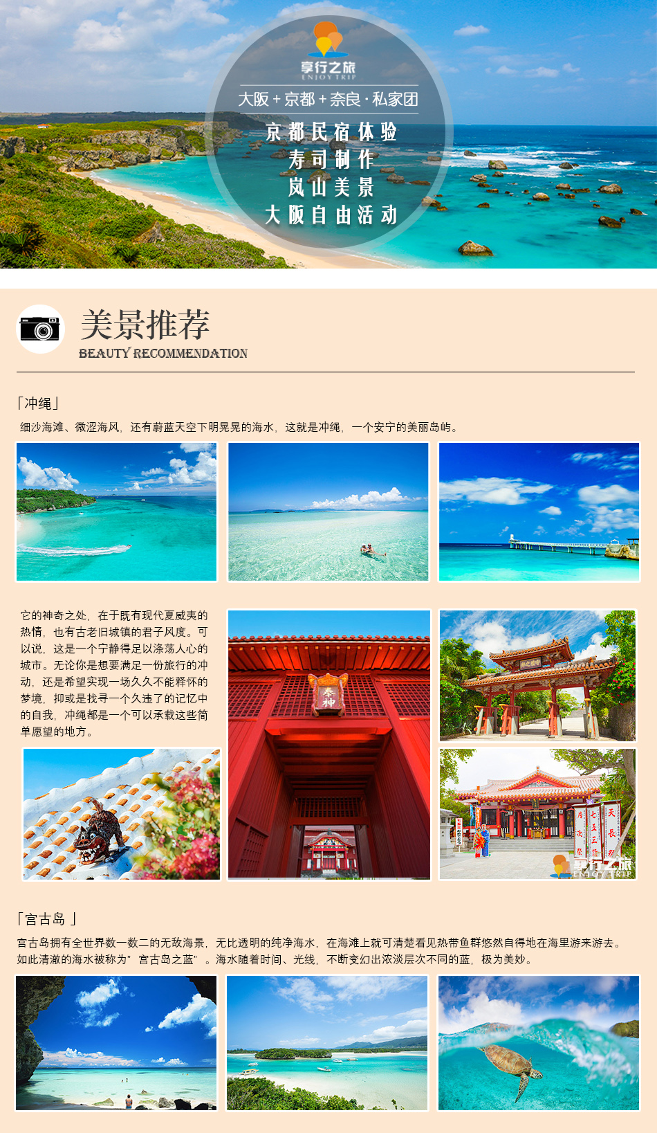 行程:今天您的專屬導(dǎo)游上島迎接,上午搭乘內(nèi)陸航班前往沖繩那霸機(jī)場(chǎng)。在那霸機(jī)場(chǎng)購(gòu)買禮品后返回中國(guó),結(jié)束愉快的行程。