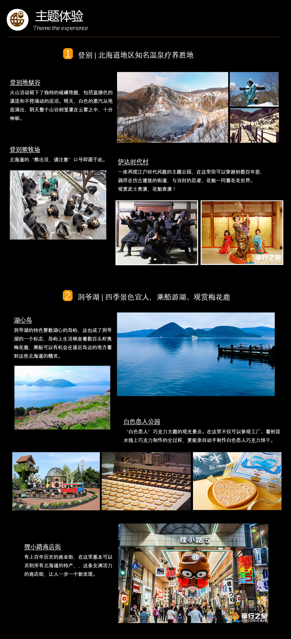 【登別熊牧場(chǎng)】在登別熊牧場(chǎng)可以通過(guò)小熊幼兒園、學(xué)者熊表演、以及被眾多棕熊包圍的驚險(xiǎn)萬(wàn)分的“人柵欄”從近處觀察棕熊。此外這里還有世界上唯一一個(gè)能了解棕熊全部生態(tài)的棕熊專(zhuān)業(yè)博物館和重現(xiàn)了愛(ài)努族生活方式的Yukara之鄉(xiāng)”(Yukara是流傳在愛(ài)努族人中的敘事詩(shī)),可供游客了解棕熊的生態(tài)和愛(ài)努族人的文化。
