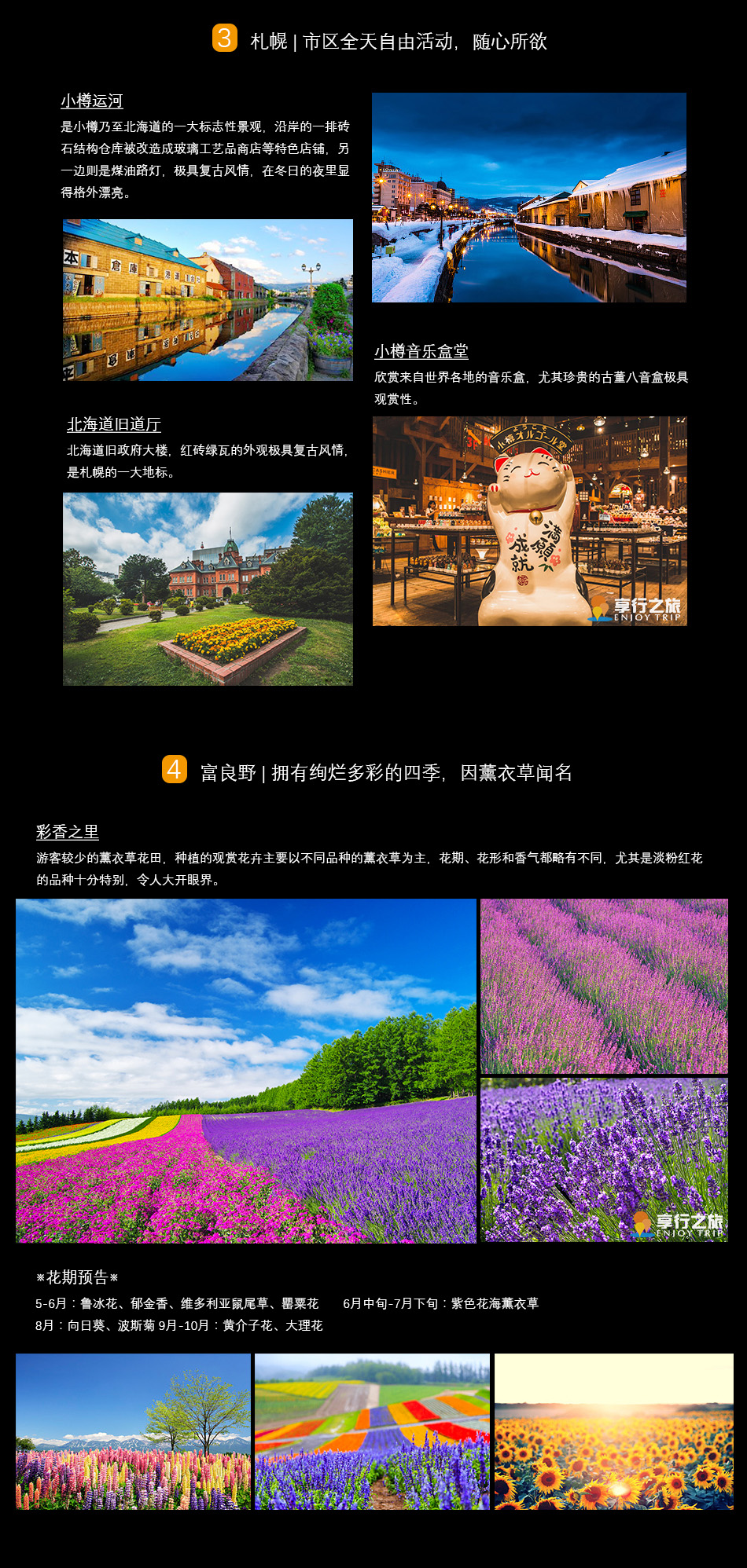 【小樽運(yùn)河】面臨日本海的小樽,從明治時(shí)代起就是國(guó)際港都,深受歐洲風(fēng)情影響,整個(gè)市街呈現(xiàn)濃厚的異國(guó)風(fēng)情。連河兩旁的倉(cāng)庫(kù)群,以及大正時(shí)代的建筑群,共同烘托出小樽運(yùn)河的風(fēng)情萬(wàn)種。而黃昏時(shí)刻的小樽運(yùn)河,則是專(zhuān)屬于戀人的,河畔煤氣燈則綻放出幽微的光芒,浪漫氣息達(dá)到極點(diǎn)。雖然小樽運(yùn)河是此地主要的精神地標(biāo),但是運(yùn)河兩旁由倉(cāng)庫(kù)前所改建而成的餐廳、酒吧、玻璃工廠等所在,才是真正令觀光客著迷的地方,古樸迷人的調(diào)調(diào),讓人徘徊留連到舍不得離去呢!