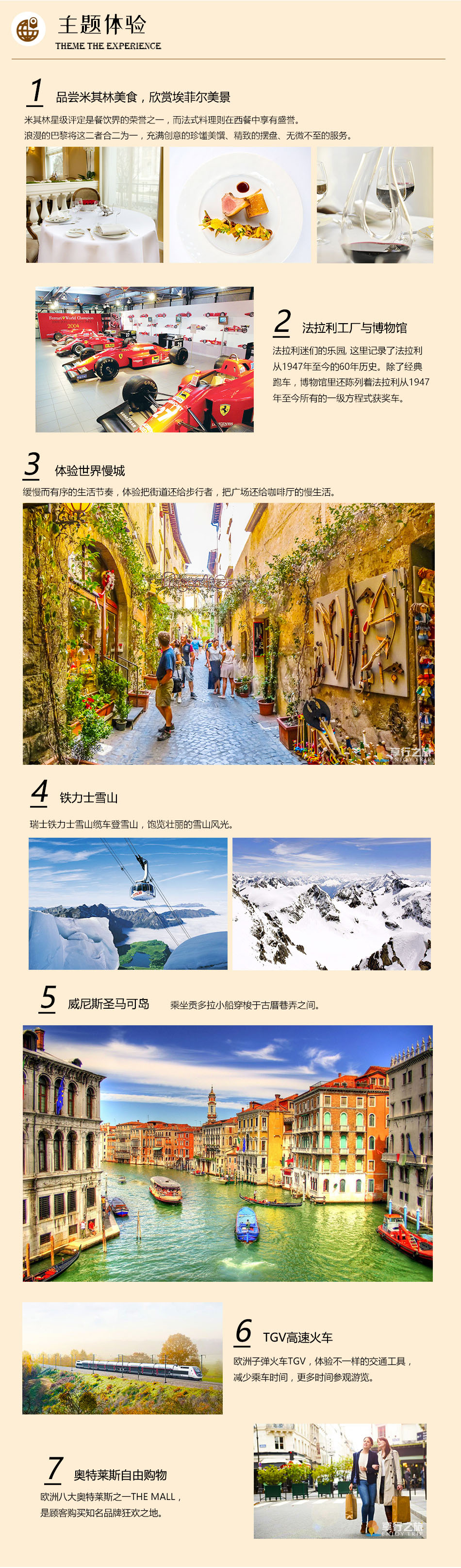 7.行程中所列景點首道大門票行程表所列旅游景點(包門票的景點:威尼斯上島船票、貢多拉游船費用、鐵力士雪山登山纜車、tgv子彈火車二等座、盧浮宮及專業(yè)導游講解、法拉利博物館)