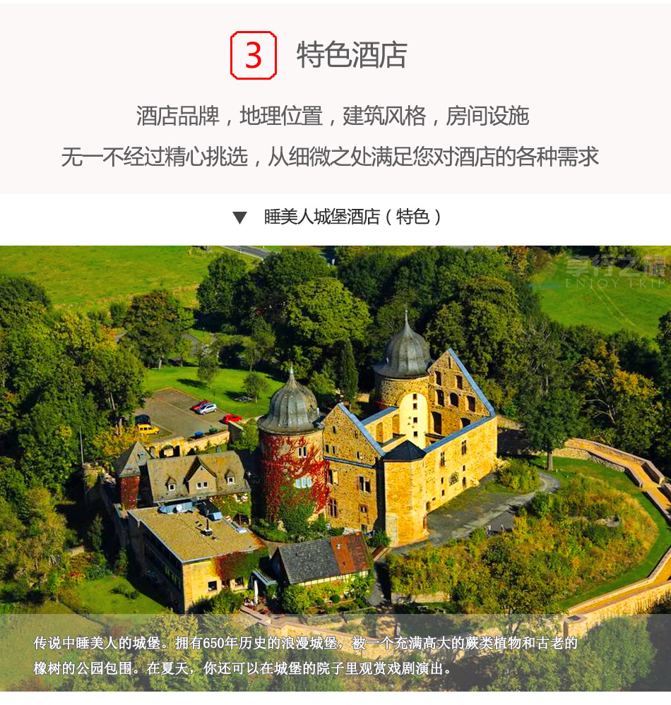 睡美人宮殿沙巴堡(DornroeschenschlossSababurg)坐落在夢幻般的萊茵漢德森林,她是格林兄弟筆下的童話宮殿,是德國童話大道的中心?,F(xiàn)在是一座旅館兼餐廳加劇場。圍繞著睡美人宮殿的是歐洲古老的自然動物公園。 游覽傳說中的睡美人城堡,這個古堡早在13世紀已建成,經(jīng)過數(shù)百年間多次的破壞、重建和修筑之后,今天被改建為睡美人古堡酒店。古堡酒店被歐洲古老的森林公園包圍著,有種世外桃源的感覺。