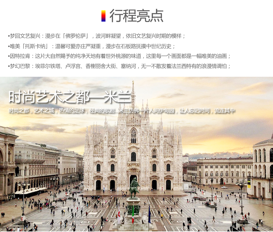 6、行程中所列景點(diǎn)首道大門票羅馬馬車巡游、斗獸場(chǎng)門票、米蘭大教堂、凡爾賽宮、烏菲茲美術(shù)館、貢多拉游船、盧浮宮。其余為免票或外觀。
