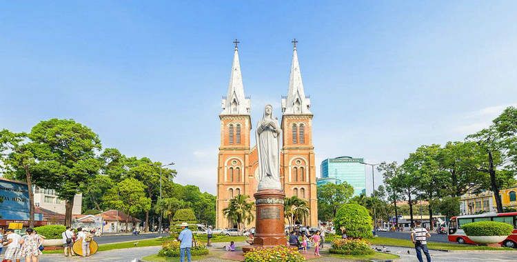 西貢圣母大教堂是胡志明市的地標(biāo)建筑之一,位于市中心,建于19世紀(jì)末。典型的哥特式建筑,正面有兩座40米高的鐘樓,仿照巴黎圣母院而設(shè)計(jì)。在教堂前方的花園廣場上,佇立著一座重達(dá)4噸的圣母瑪利亞雕像,為1945年羅馬教會相贈的禮物。