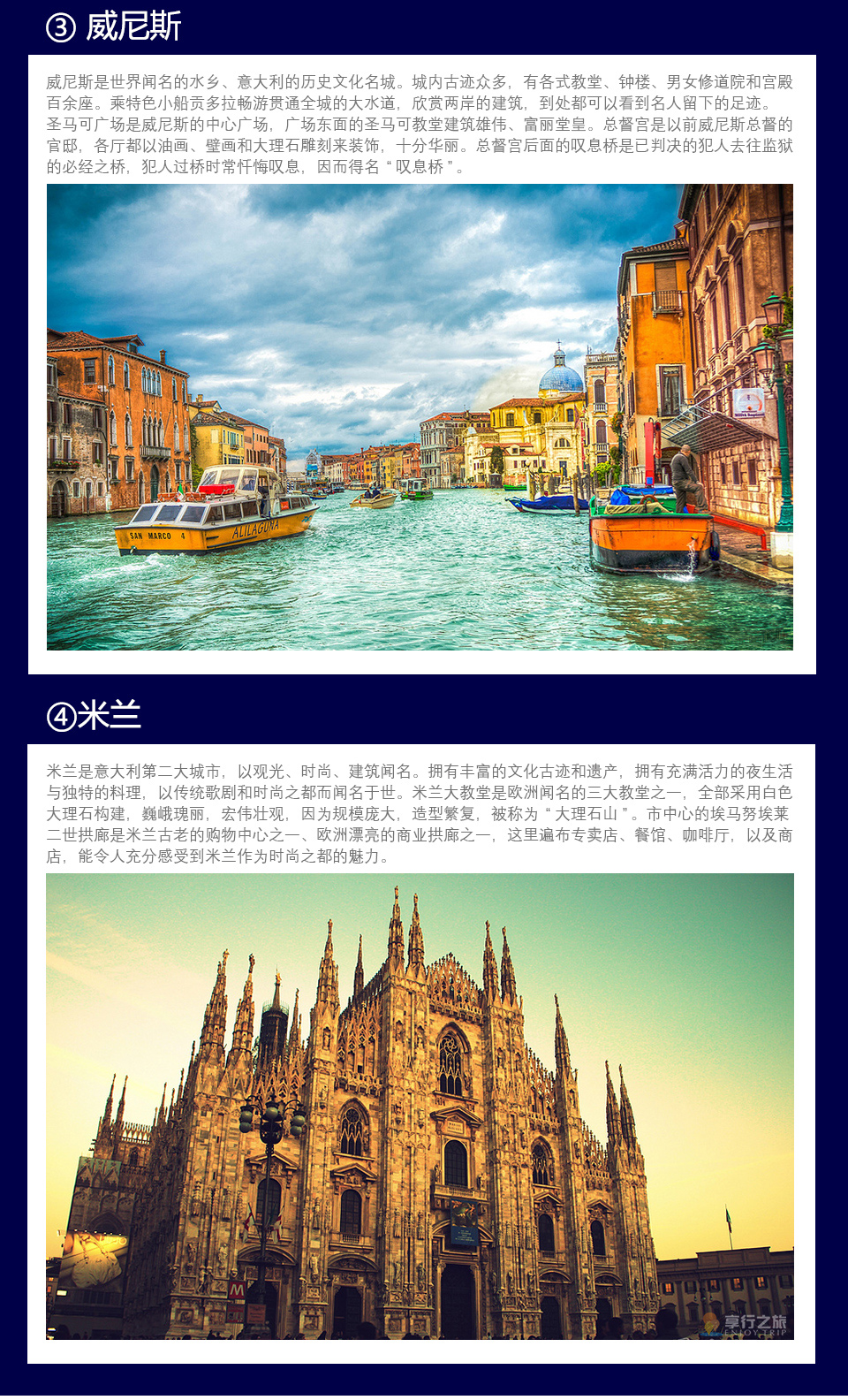 米蘭是意大利第二大城市,以觀光、時尚、建筑聞名。擁有豐富的文化古跡和遺產,擁有充滿活力的夜生活與獨特的料理,以傳統歌劇和時尚之都而聞名于世。米蘭大教堂是歐洲三大教堂之一,全部采用白色大理石構建,巍峨瑰麗,宏偉壯觀,因為規(guī)模龐大,造型繁復,被稱為“大理石山”。市中心的埃馬努埃萊二世拱廊是米蘭古老的購物中心之一、歐洲漂亮的商業(yè)拱廊之一