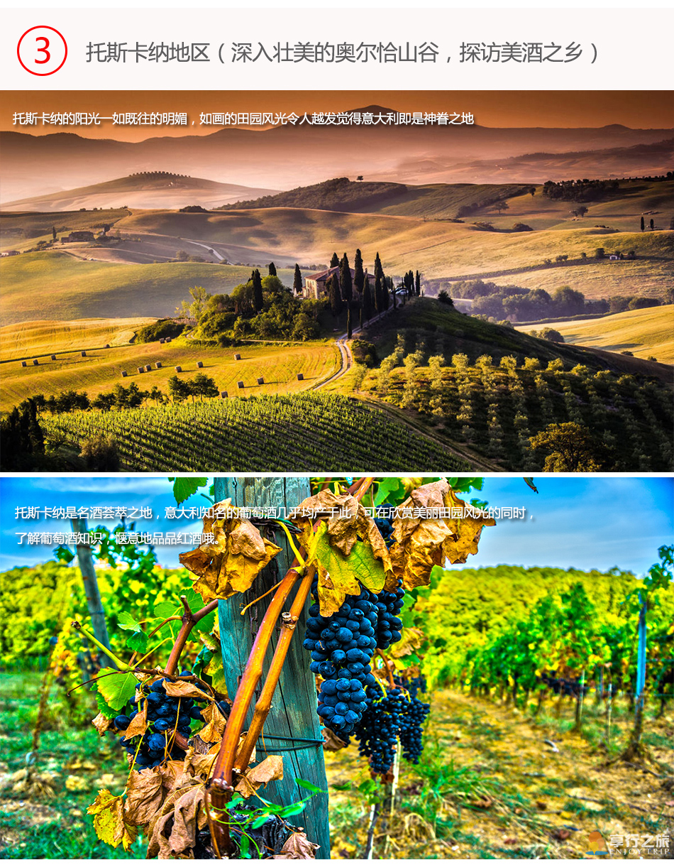 從錫耶納向南延伸出的山谷被稱為瓦道爾恰山谷,這里以起伏平緩、精心耕作的丘陵地帶,和穿插其間的風(fēng)景如畫的村鎮(zhèn)而聞名。這里丘陵、農(nóng)莊、城堡、別墅構(gòu)成了典型的托斯卡納田園風(fēng)光,是從文藝復(fù)興繪畫到現(xiàn)代攝影作品的題材。