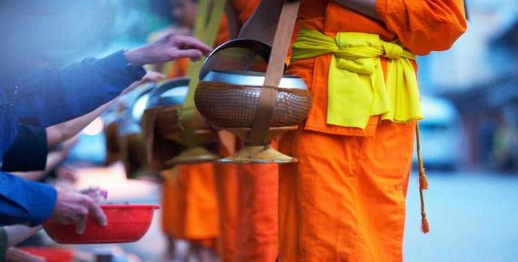 清晨:在酒店工作人員的陪同下參加瑯勃拉邦清晨布施。天還未亮,一列列穿著橙色袈裟的僧人們,上街接受百姓們的布施。布施結(jié)束后去參觀當?shù)厥屑?,感受當?shù)鼐用竦纳畋旧V蠓祷鼐频晗碛迷绮汀?br />