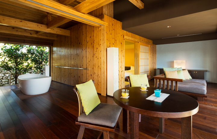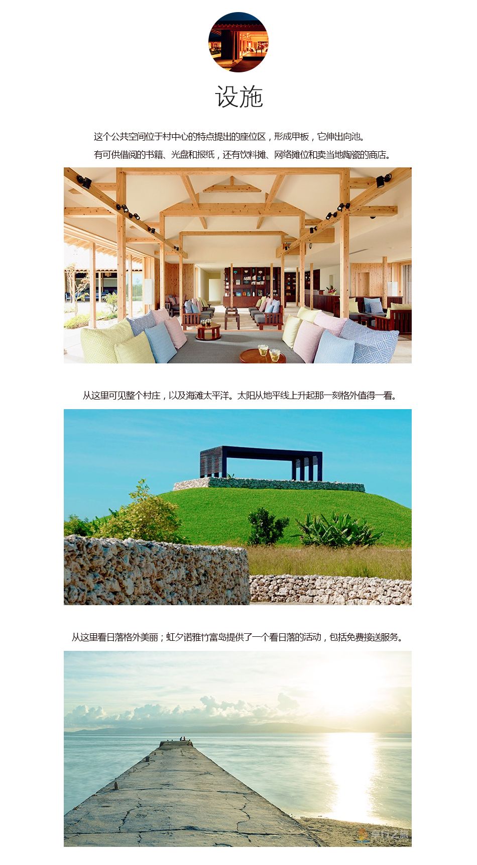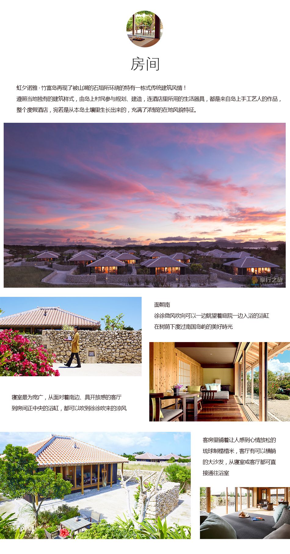 酒店位于從石垣島出發(fā)坐高速船約10分鐘即可到達的,受到守護神獅子庇護的紅瓦屋頂村落——竹富島。虹夕諾雅沖繩再現(xiàn)了被山湖的石垣所環(huán)繞的特有一棟式傳統(tǒng)建筑風情!能夠真正展現(xiàn)正宗的日本,并重視地方傳統(tǒng)的價值觀,與大自然共同發(fā)展,融入現(xiàn)代感性的度假酒店。遵照當?shù)鬲氂械慕ㄖ邮?,由島上村民參與規(guī)劃、建造,連酒店里所用的生活器具,都是來自島上手工藝人的作品,整個度假酒店,宛若是從本島土壤里生長出來的,充滿了濃郁的在地風貌特征。 -