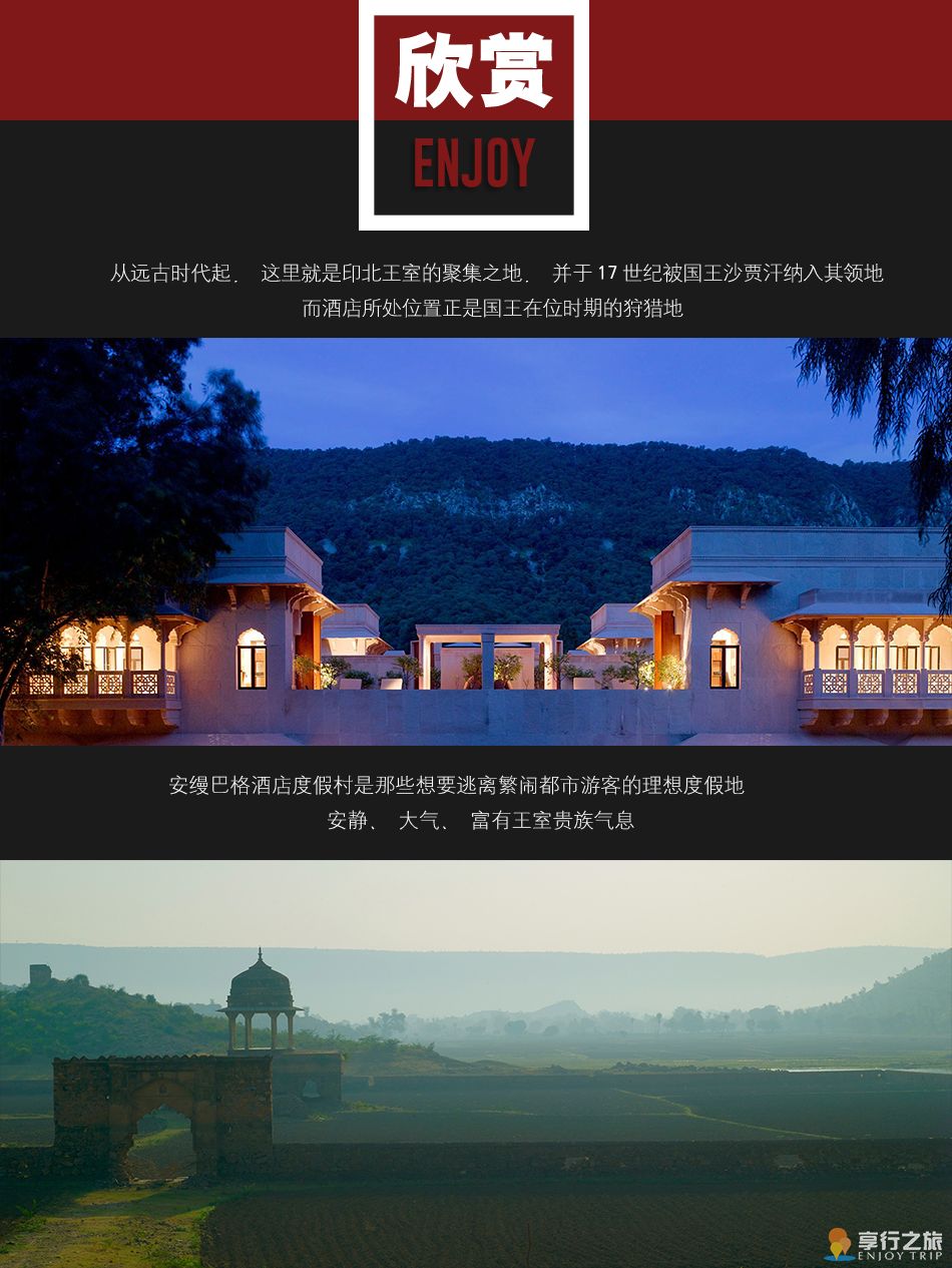 安縵巴格酒店度假村位于印度北部的阿爾瓦爾。從遠古時代起,這里就是印北王室的聚集之地,并于17世紀被國王沙賈汗納入其領地,而酒店所處位置正是國王在位時期的狩獵地。與其它旅游勝地相比,阿爾瓦爾安靜許多,是那些想要逃離繁鬧都市游客的理想度假地。而安縵巴格酒店度假村就像這座城一樣,安靜、大氣、富有王室貴族氣息。