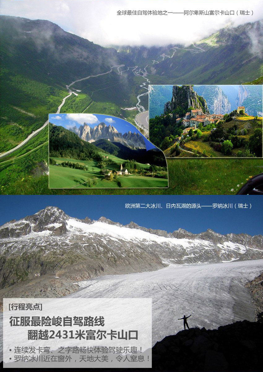 今天將體驗全程中險要的旅程,翻越阿爾卑斯山,經(jīng)歷非凡的冰河快車之路。此段行程全部在阿爾卑斯山脈中行進,經(jīng)過一段壯麗的瓦爾瑟人之路后,到達重要的交通要塞安德瑪特。途中您將看到位于海拔1800的雪融湖——歐博湖(Oberalpsee);翻過海拔2431米的富卡山口后,歐洲第二大冰川羅納冰川將呈現(xiàn)您的面前;途徑菲施 (Fiesch),欣賞歐洲第一大冰川阿萊奇冰川(Aletsch Glacier)大拐彎處的壯觀景致。
