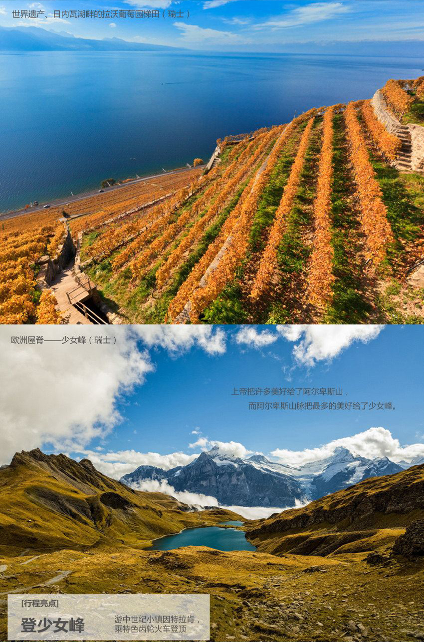 少女峰(需自費)在瑞士,有一則古老的傳說:傳說天使來到凡間,在一座美麗的山谷里居住下來,并且還為它鋪上了無盡的鮮花和森林,鑲嵌了銀光閃爍珠鏈,還為它許愿說“從現(xiàn)在起,人們都會來親近你、贊美你,并愛上你”,這座使天使都心醉的山說的就是瑞士少女峰。