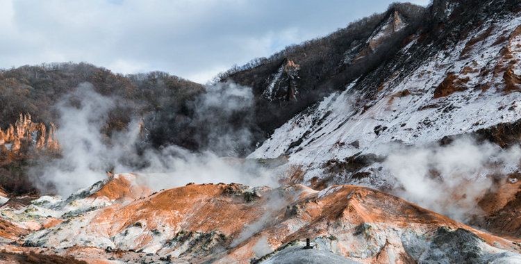 登別地獄谷-白色火山氣體繚繞的溫泉谷地,可以看到熱騰騰的泉眼和流動(dòng)的泉水。