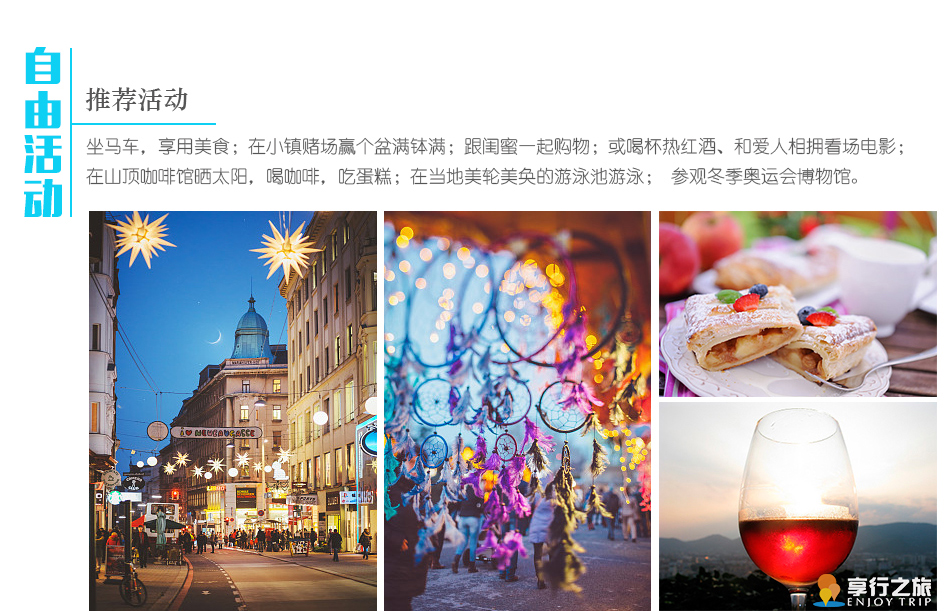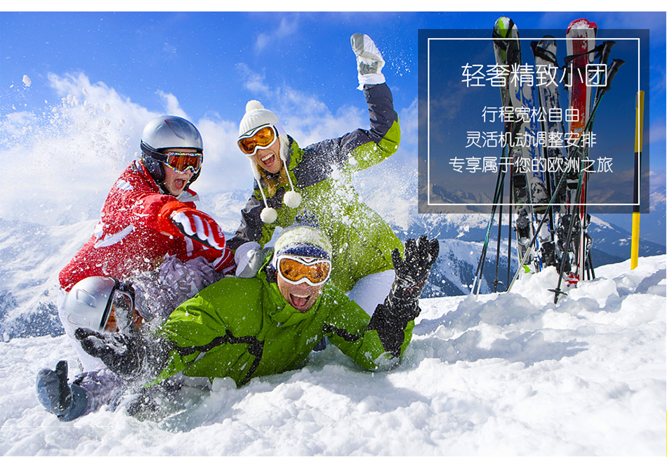 酒店當(dāng)?shù)貥?biāo)準(zhǔn)3-4*當(dāng)?shù)靥厣频?/span>滑雪:選擇一個(gè)為期三天,每天四小時(shí)的滑雪訓(xùn)練班報(bào)名,熟練掌握或提升滑雪技巧。搭乘高山火車領(lǐng)略海拔2300多米的阿爾卑斯山區(qū)雄奇的自然美景,呼吸純凈的空氣,感受一個(gè)寧?kù)o祥和的冰雪世界?;蜻\(yùn)用學(xué)到的滑雪技巧,規(guī)劃一段長(zhǎng)距離雪地越野行程;或嘗試歐洲人喜愛(ài)的雪地徒步,這種酷勁十足的活動(dòng)既能鍛煉身體,又有機(jī)會(huì)飽覽沿途風(fēng)光。