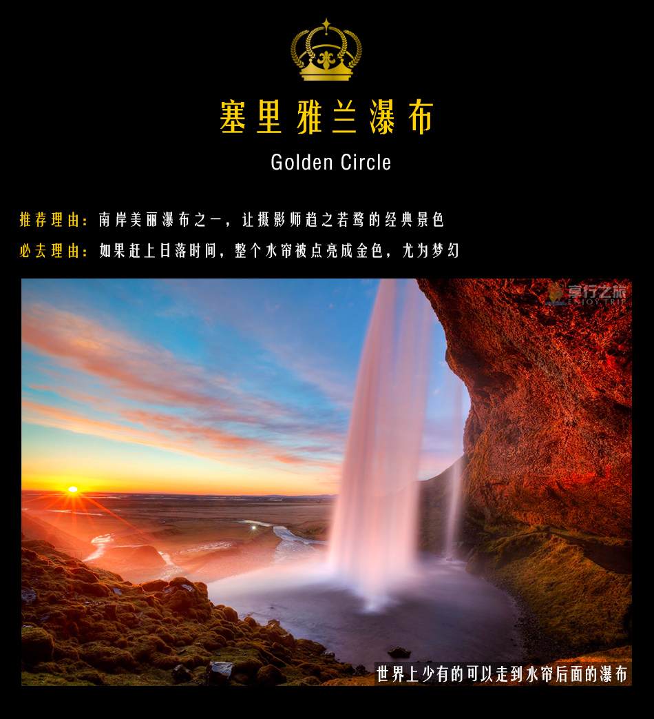 黃金瀑布-人稱瀑布“皇后”。她是冰島斷層瀑布,寬約2500米,其水勢分成兩段,總高差70多米,氣勢磅礴,景色壯觀。滔滔河水奔騰咆哮,轟鳴中直瀉32米,而后又急墜于72米深、2.5公里長的峽谷之中。 奔騰的河水在急瀉過程中激起漫天水霧,沸騰的水霧在陽光下形成道道彩虹,金光閃閃,仿佛黃金般靚麗,故而得名"黃金瀑布"。